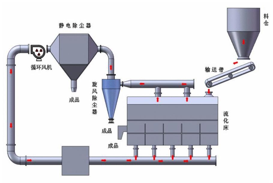 流化床干燥設備是一種高效的干燥設備,適用于無凝聚作用的散粒狀物料的干燥。其工作原理是濕物料進入流化床內(nèi)與熱空氣接觸,形成流化狀態(tài),使物料顆粒與熱空氣充分混合,進行強烈的傳熱和傳質,從而脫除水分,達到干燥效果。合格的產(chǎn)品由流化床的出料口排出,含塵氣體則經(jīng)過除塵裝置凈化后排放。